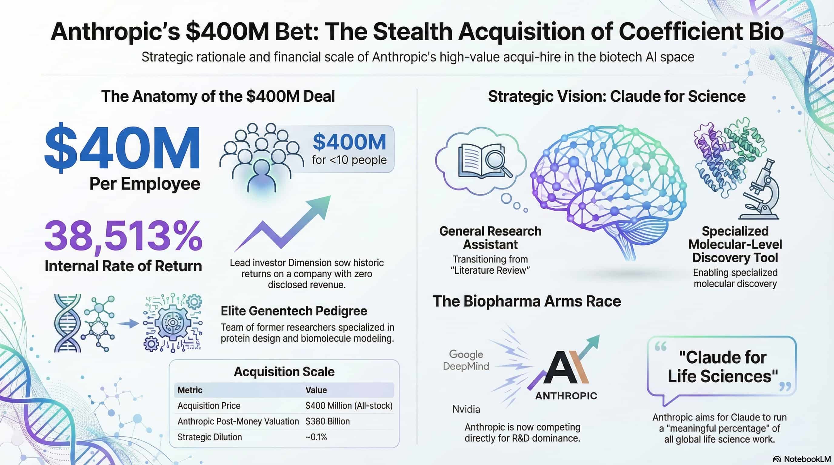 Anthropic has acquired Coefficient Bio, a stealth-mode AI biotech startup founded eight months ago by former Genentech researchers Nathan Frey and Samuel Stanton, in a deal valued at over $400 million in stock. The team — fewer than ten people — built a platform targeting pharmaceutical research planning, drug target identification, and regulatory strategy. The venture capital firm Dimension, which held a significant stake, is reporting a return of over 38,000 percent on its investment.