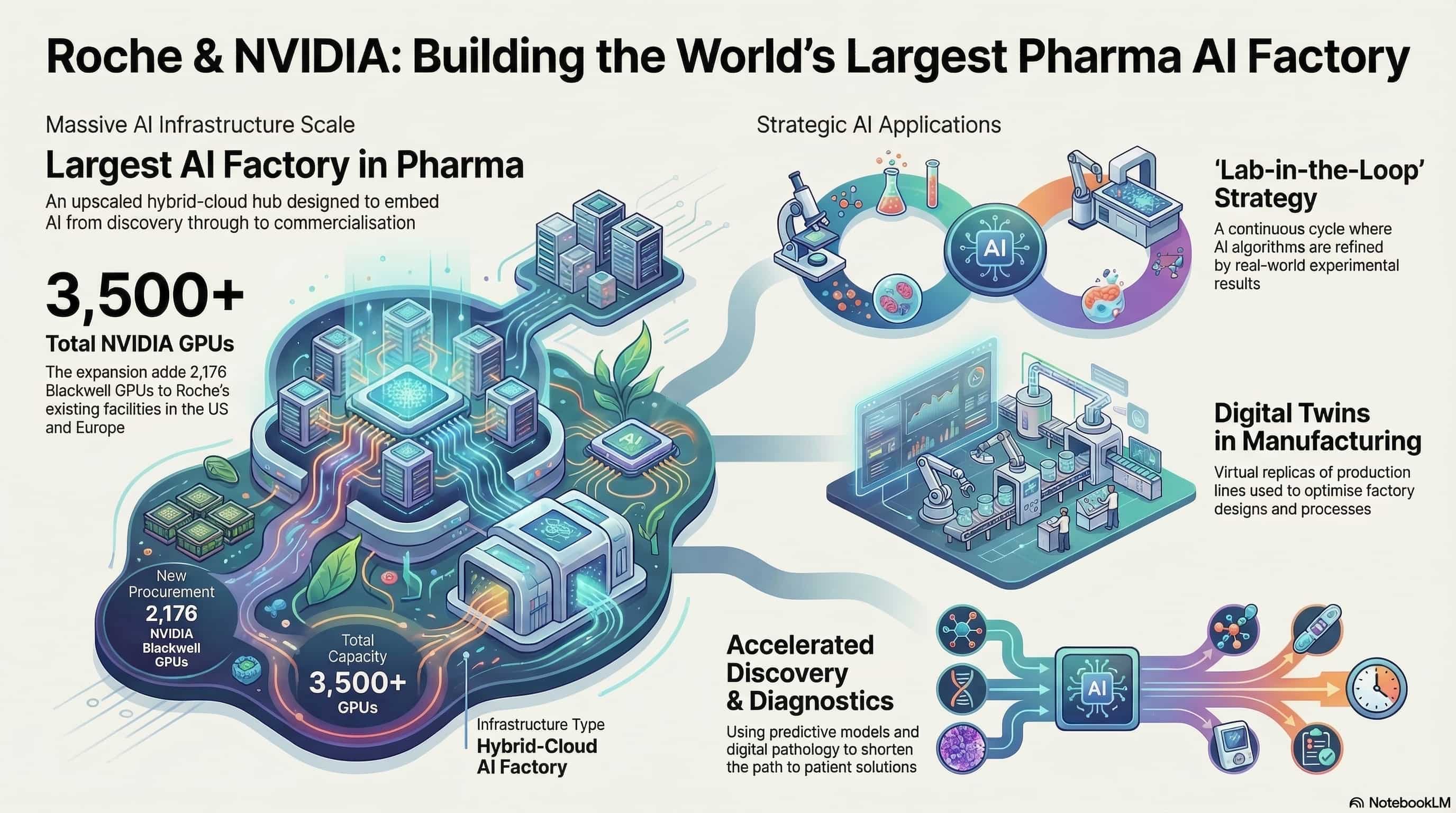 Roche activated 2,176 new NVIDIA Blackwell GPUs this week, bringing its total to over 3,500 across the U.S. and Europe — the largest declared AI compute footprint in the pharmaceutical sector. The architecture is built around the Lab-in-the-Loop framework: continuous feedback between wet-lab experiments and AI models, with NVIDIA Omniverse powering digital twins of production lines and BioNeMo handling biology-specific model training. This is not a research unit. It is a new operating model for drug development across discovery, manufacturing, and diagnostics.