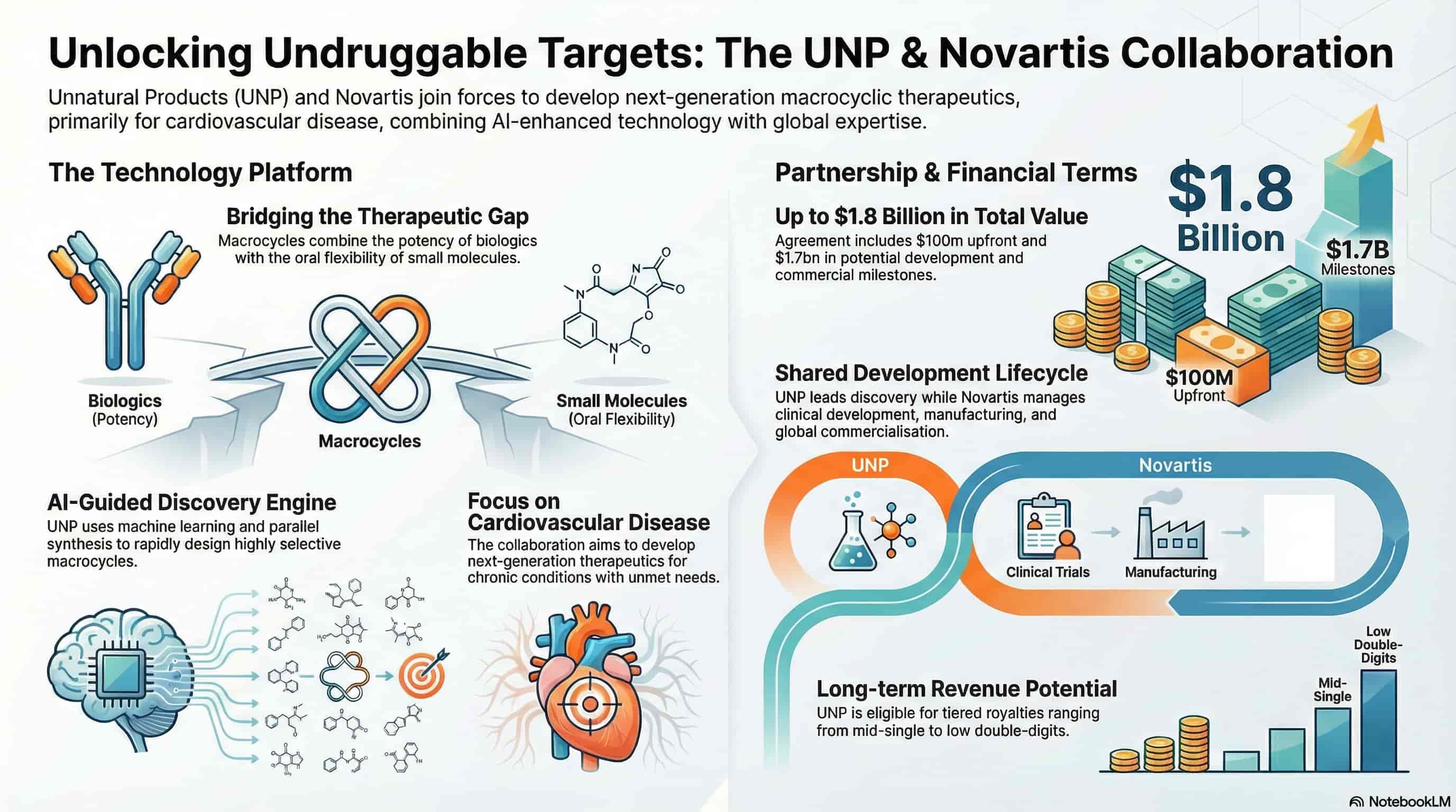 Novartis signed a licensing collaboration with Unnatural Products (UNP), with deal economics including up to $100M in upfront and pre-IND milestones and up to $1.7B in downstream development, regulatory and commercial milestones. UNP’s AI-enhanced macrocycle platform is designed to address historically “undruggable” targets, with potential cardiovascular applications.